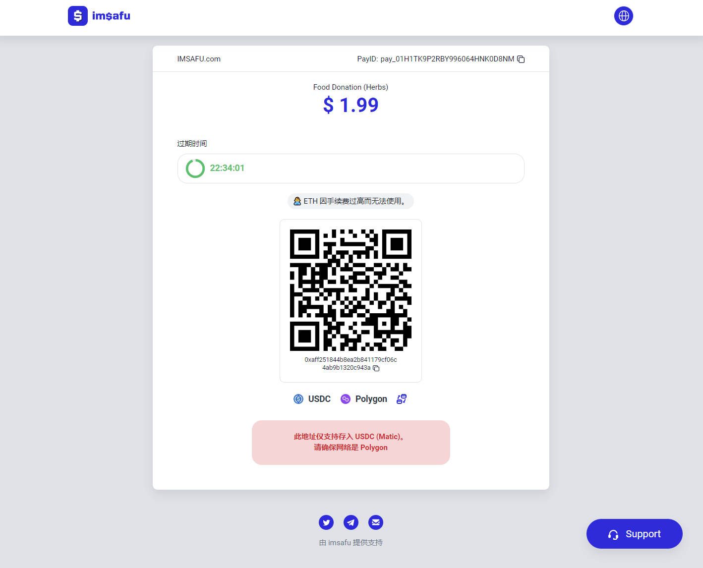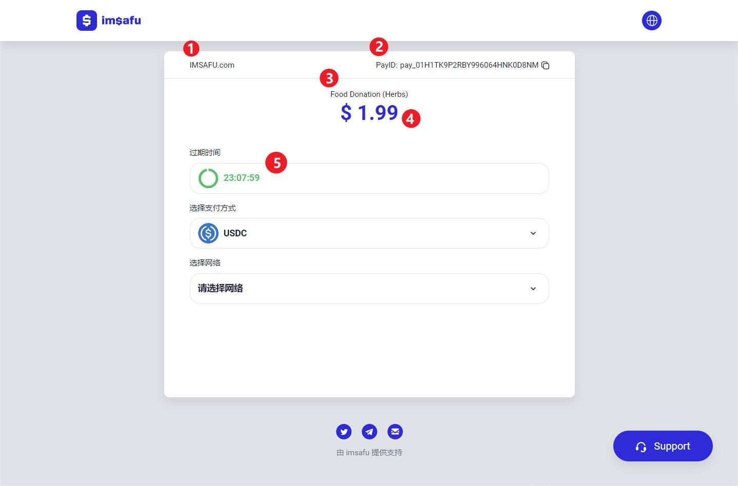 使用 imsafu 支付非常简单,我们将以 Donate Food to imsafu Demo 为例为您介绍整个支付流程。