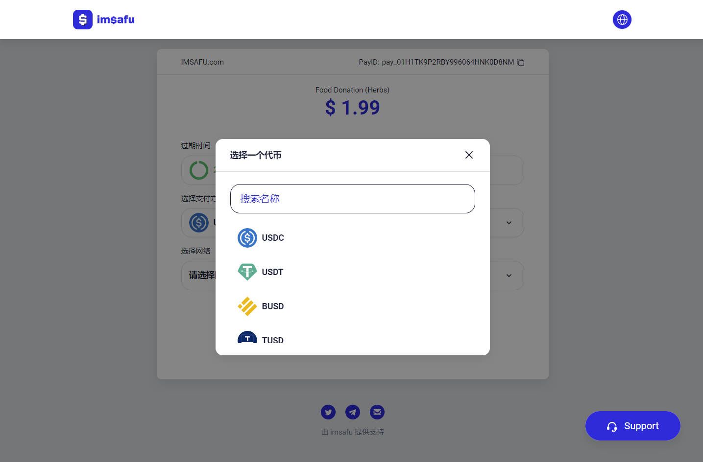 imsafu 选择了 USDC 作为默认的支付方式,您可以点击并选择您所需要的代币。
