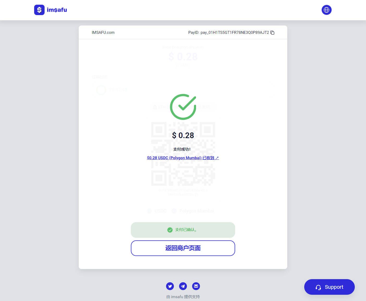 接入 imsafu 的商户会提供一个地址方便您可以查询支付订单的结果。您只需要点击返回商户页面即可快速的回到商户订单界面,进行商户应用中的后续操作。